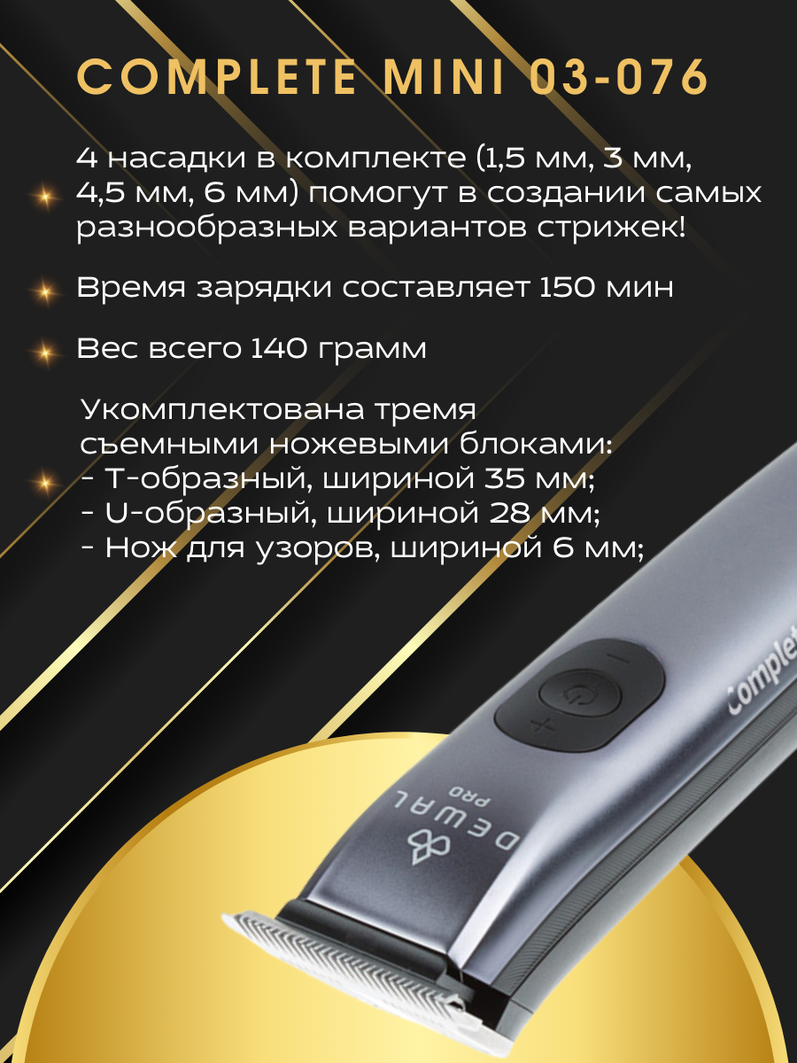 Машинка для стрижки окантовочная DEWAL PRO COMPLETE MINI, 5000-7000 оборотов минуту, 3 ножа, 0.5 мм, 4 насадки 03-076