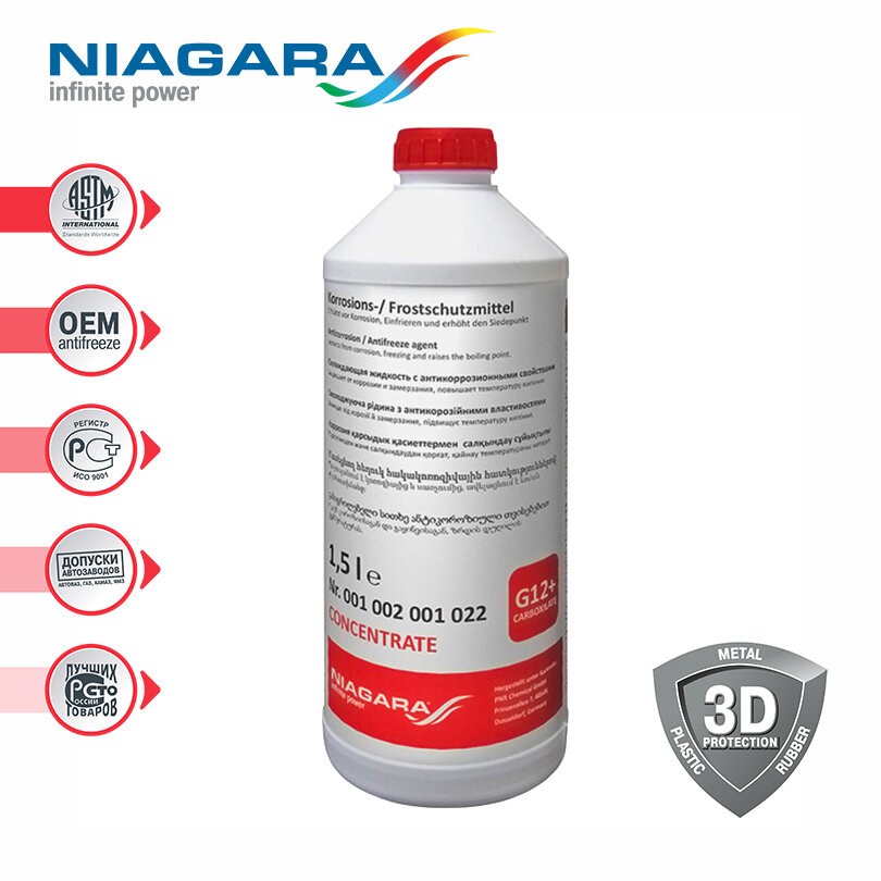Ниже Вы можете прочитать отзывы на Жидкость охлаждающая концентрат антифриза "NIAGARA" G12+ (красный) 1,5 л, ознакомится с подробными характеристиками, посмотреть интересные обзоры и фотографии на Жидкость охлаждающая концентрат антифриза "NIAGARA" G12+ (красный) 1,5 л.