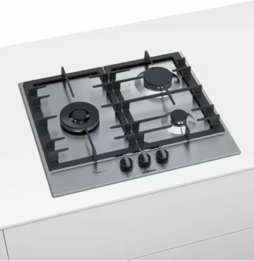 Встраиваемая варочная панель Bosch Газ, 60 см, 3 конфорки, горелка с двойным пламенем, тип - нержавеющая сталь, независимая, серебристый цвет