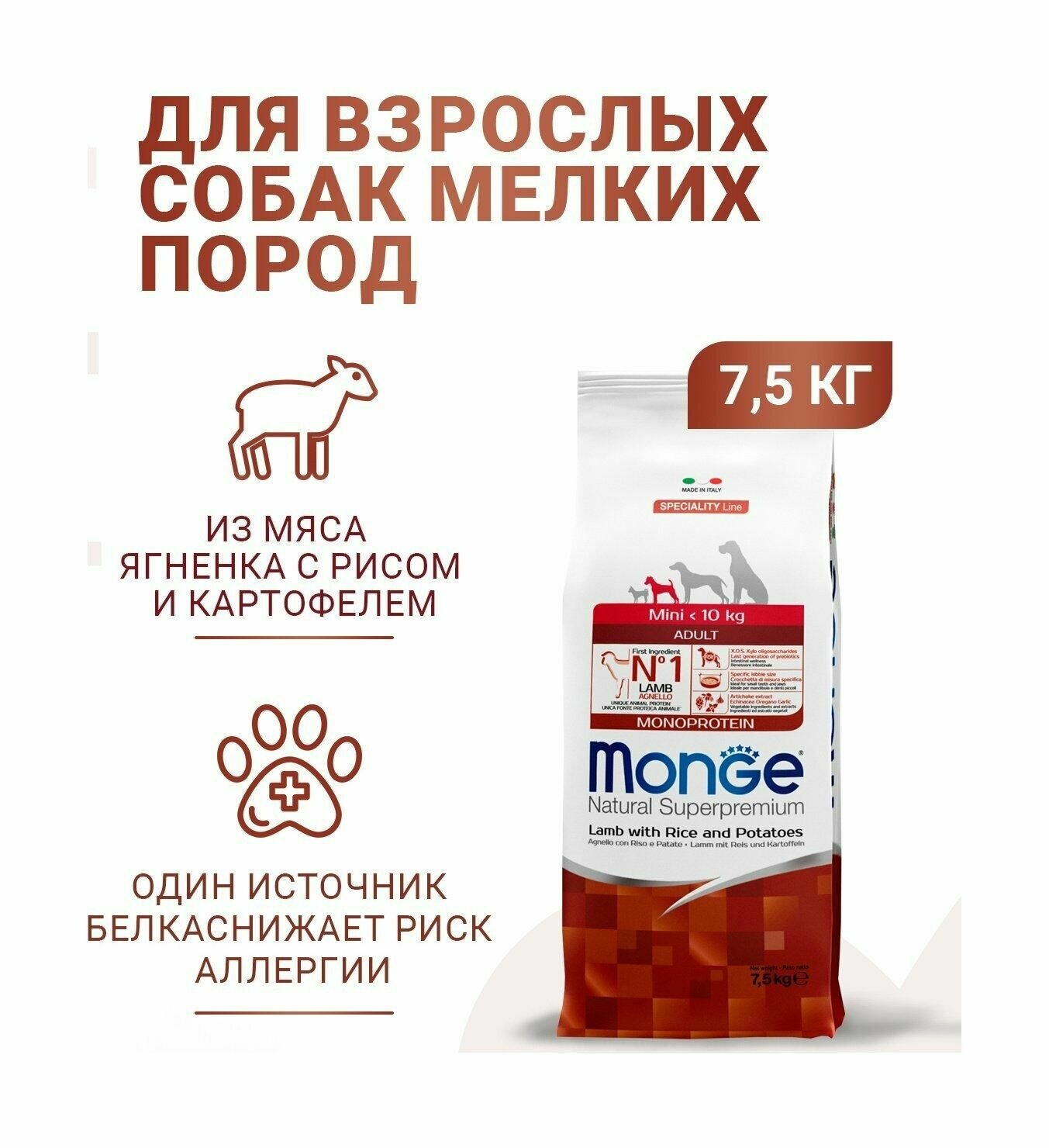 Сухой корм Monge Dog Speciality Line Monoprotein Mini, для взрослых собак мелких пород, из ягненка с рисом и картофелем 7,5 кг