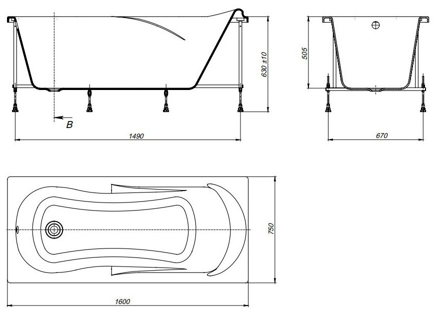 Ванна прямоугольная Roca акриловая Uno 1600х750 мм арт. ZRU9302869 (без гидромассажа), (без монтажного комплекта/ножек)