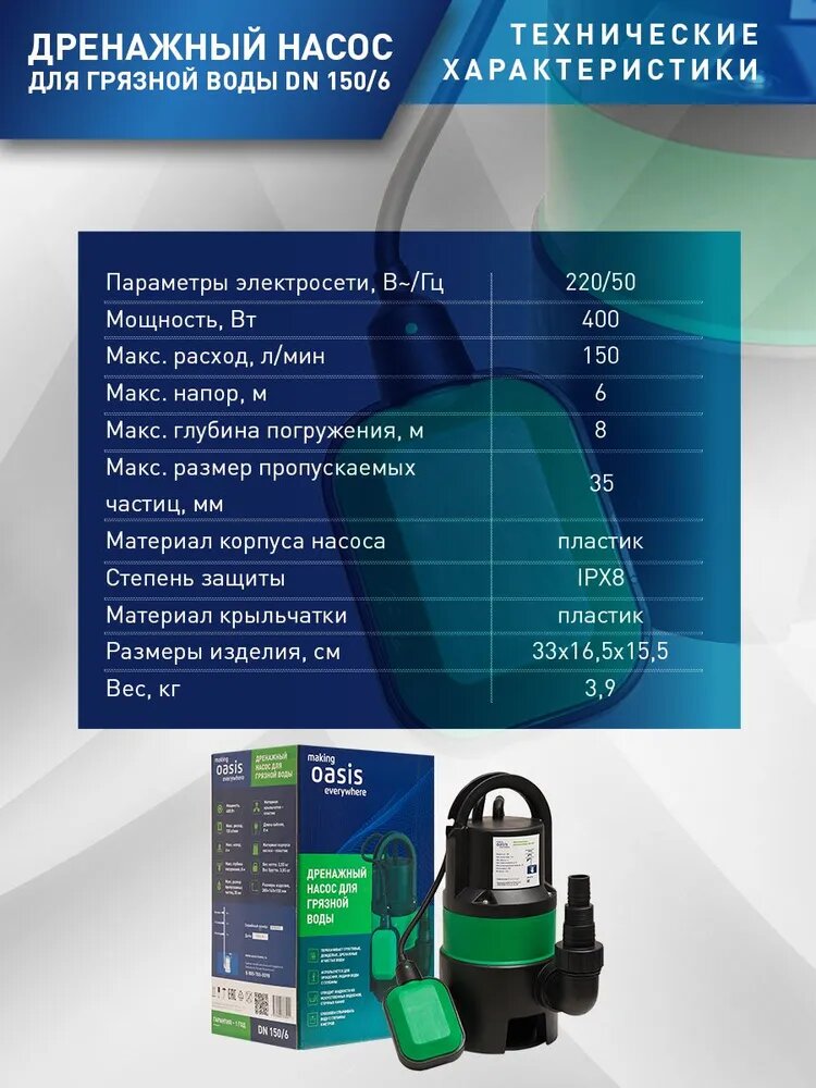 Насос дренажный Oasis DN 150/6, 400 Вт, напор 6 м, 150 л/мин интересное: