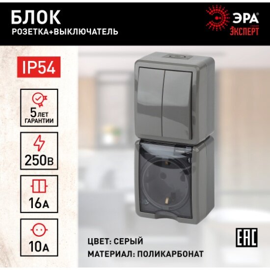 | Дополнительная информация | Блок 1-клавишный выключатель и розетка ЭРА Эксперт IP54 вертикальный с/з серый |