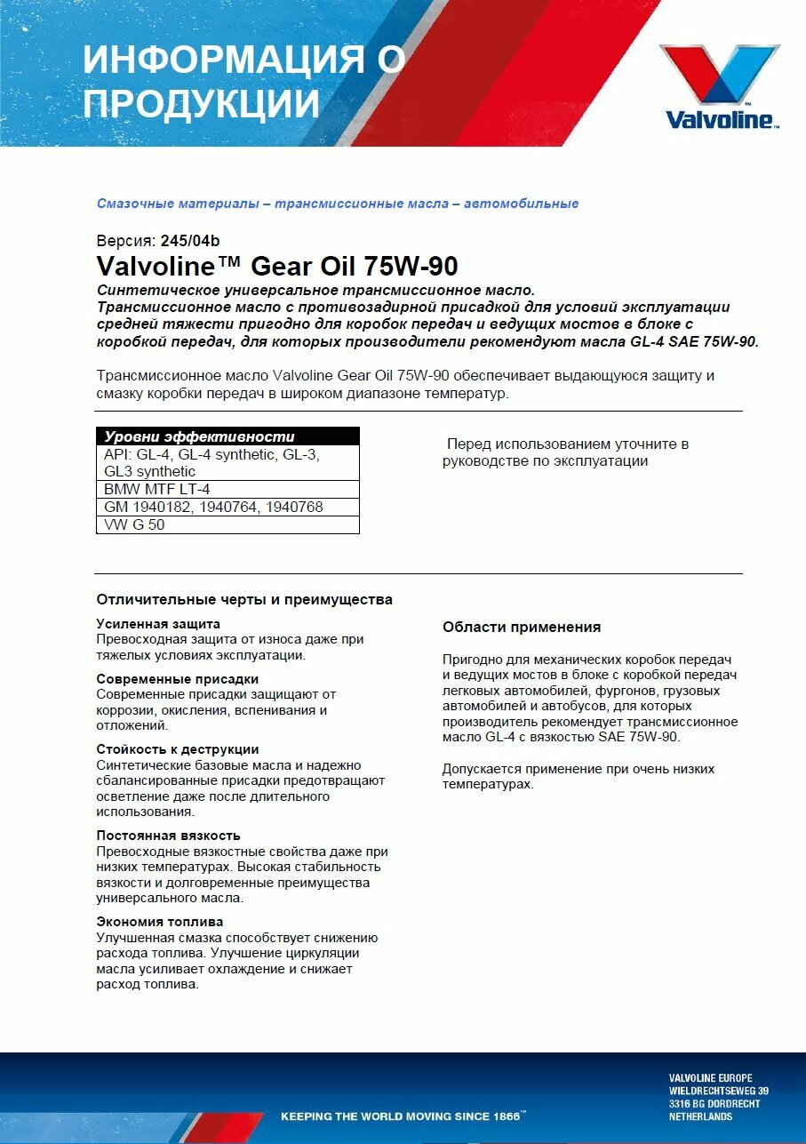 СохранитьТрансмиссионное масло Valvoline GEAR OIL GL4 75W90 1л интересное: