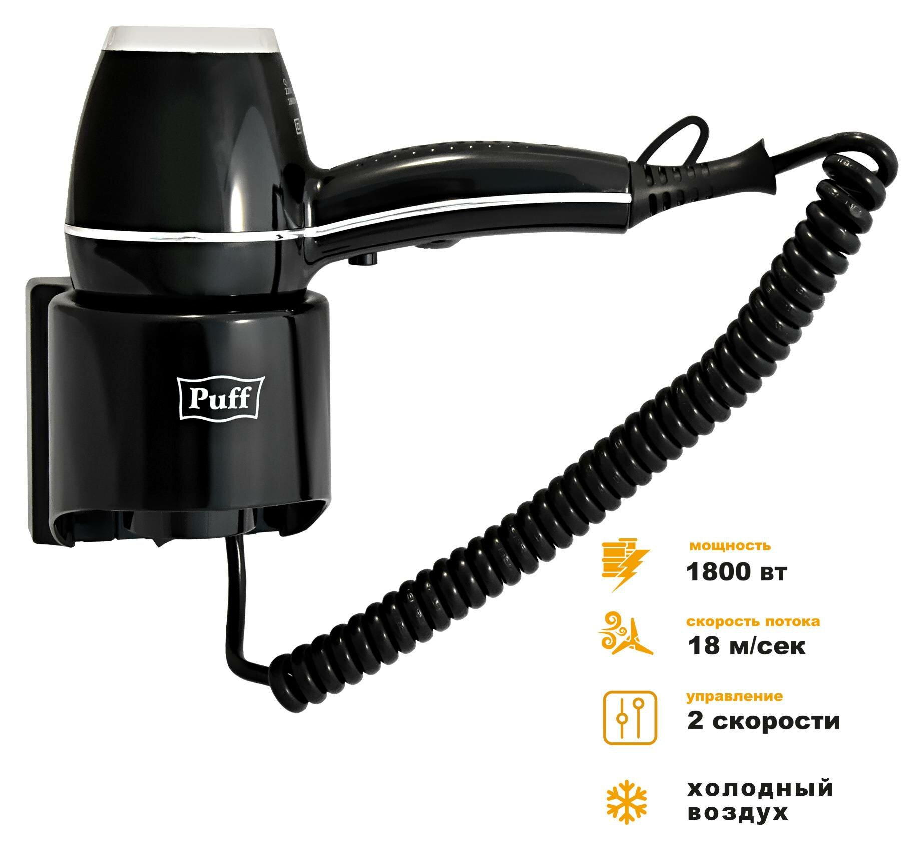 Фен Puff-1601Вl, настенный, 1600 Вт, 2 скорости, хол. воздух, чёрный 9577853