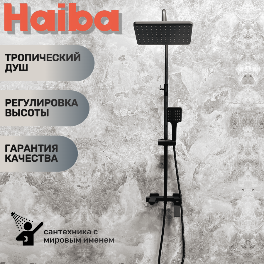 Душевая система, гарнитур HAIBA HB24818-7 с верхним тропическим душем, смесителем, монолитным изливом и ручной лейкой, черный, латунь. интересное: