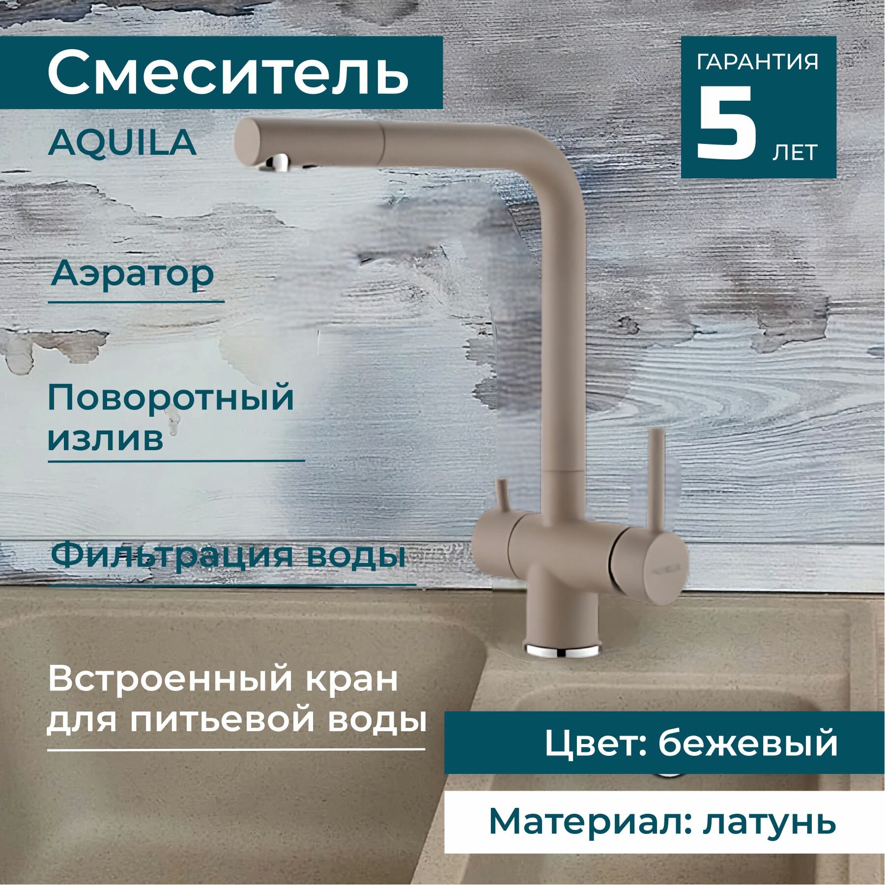 Смеситель для раковины с фильтром и краном для питьевой воды ALVEUS AQUILA G55 поворотный для кухни и ванной. Латунь. Цвет бежевый