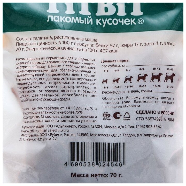 Ниже Вы можете прочитать отзывы на Лакомство для собак мини-пород TiTBiT Дольки из телятины 70 г,, ознакомится с подробными характеристиками, посмотреть интересные обзоры и фотографии на Лакомство для собак мини-пород TiTBiT Дольки из телятины 70 г,.