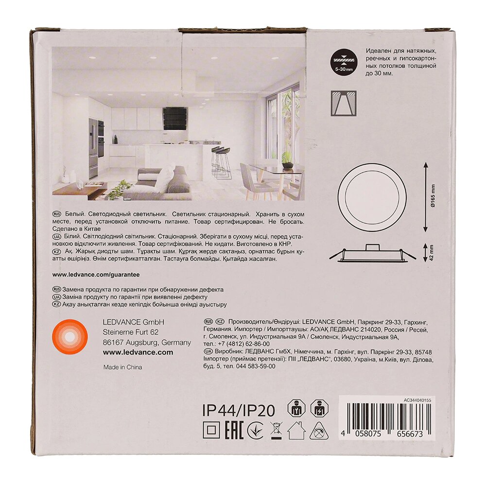 Встраиваемый светильник даунлайт Ledvance 13W 865 IP44 153 мм свет холодный белый (голубой)