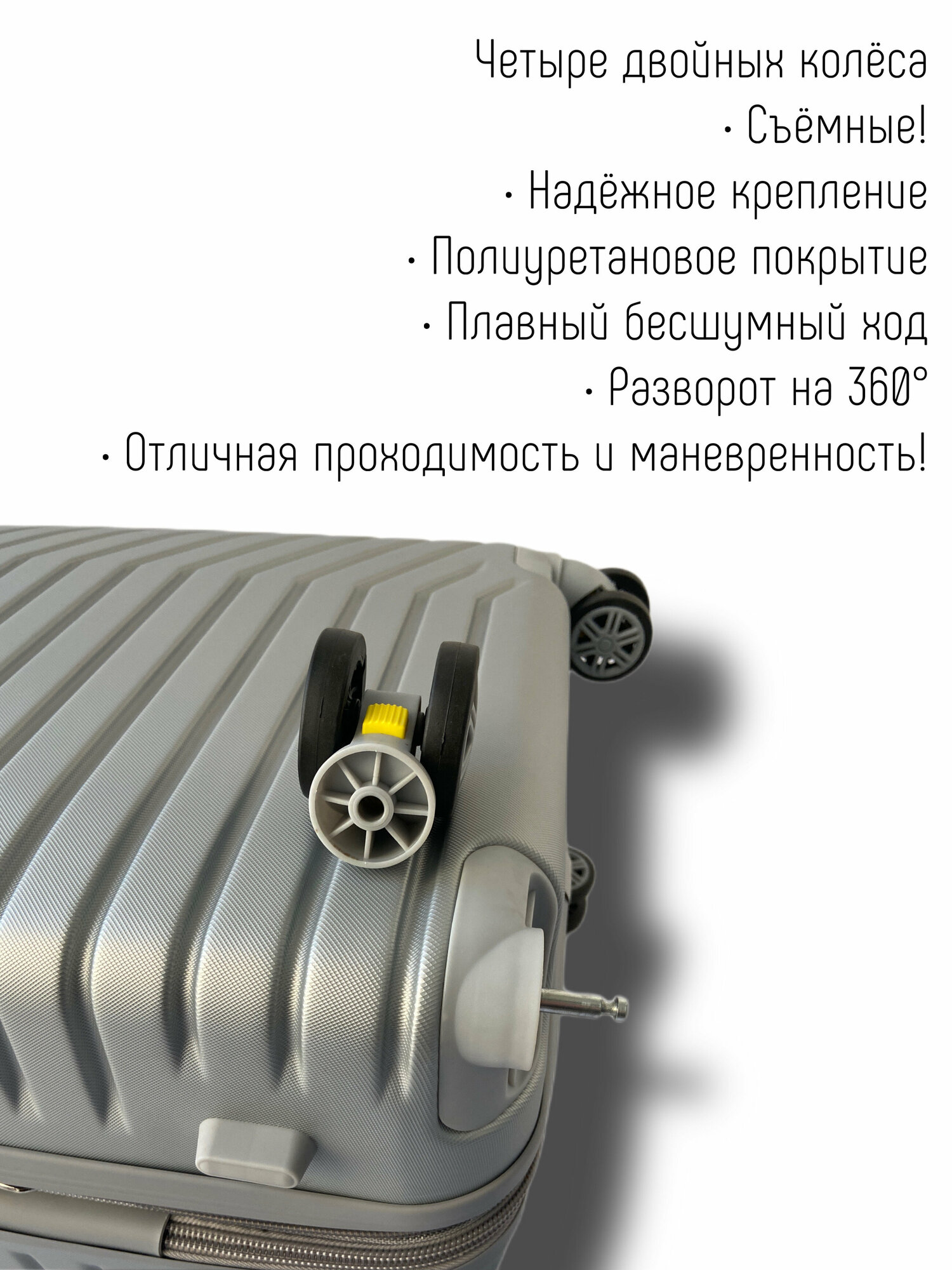 Чемодан на колесах/72 литра/поликарбонат/4 съемных колеса/серебро интересное: