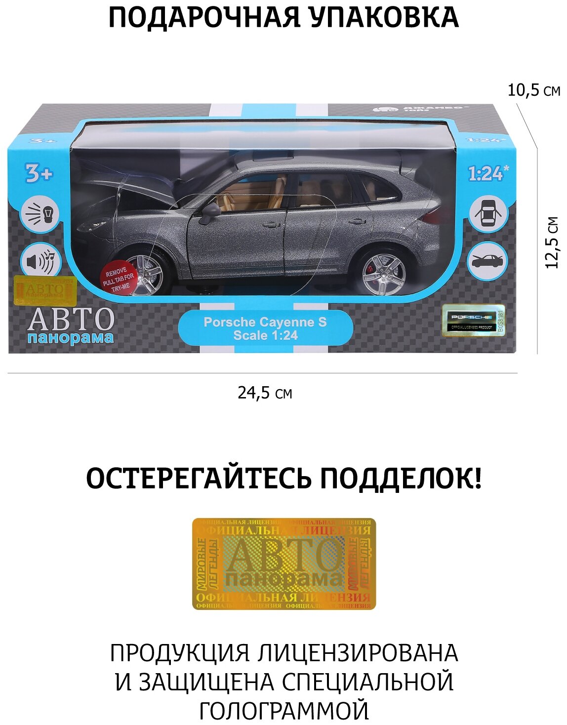 Модель машины Автопанорама 1:24 Porsche Cayenne S, серый, свободный ход колес, открываются двери, капот и багажник, свет, звук