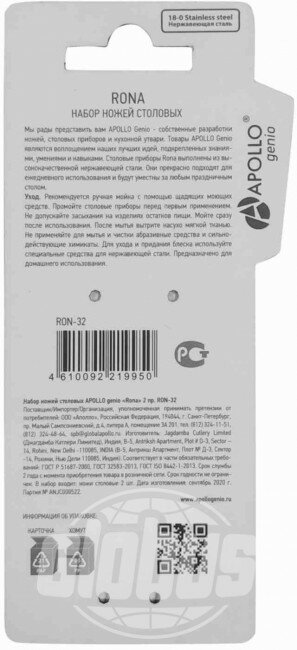 Нож нержавеющая сталь, 2 предмета, столовый, Apollo, Rona, RON-32 интересное: