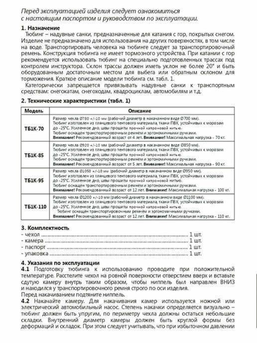 | Диаметр тюбинга | 110 см |