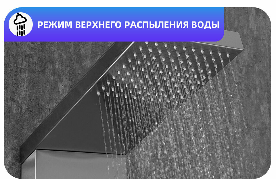 | Комплектация | душевая панель; душевая лейка 3-х режимная; смеситель; душевой шланг; крепления |
