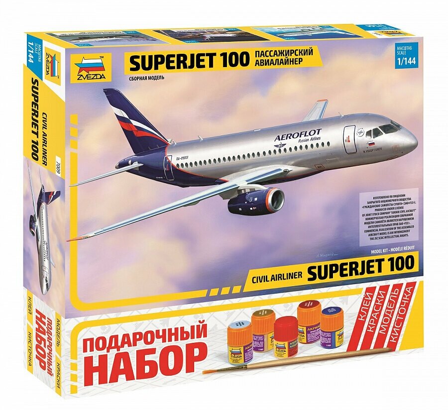 Сборная модель Звезда Пассажирский авиалайнер Superjet 100, 1/144, подарочный набор 7009ПН