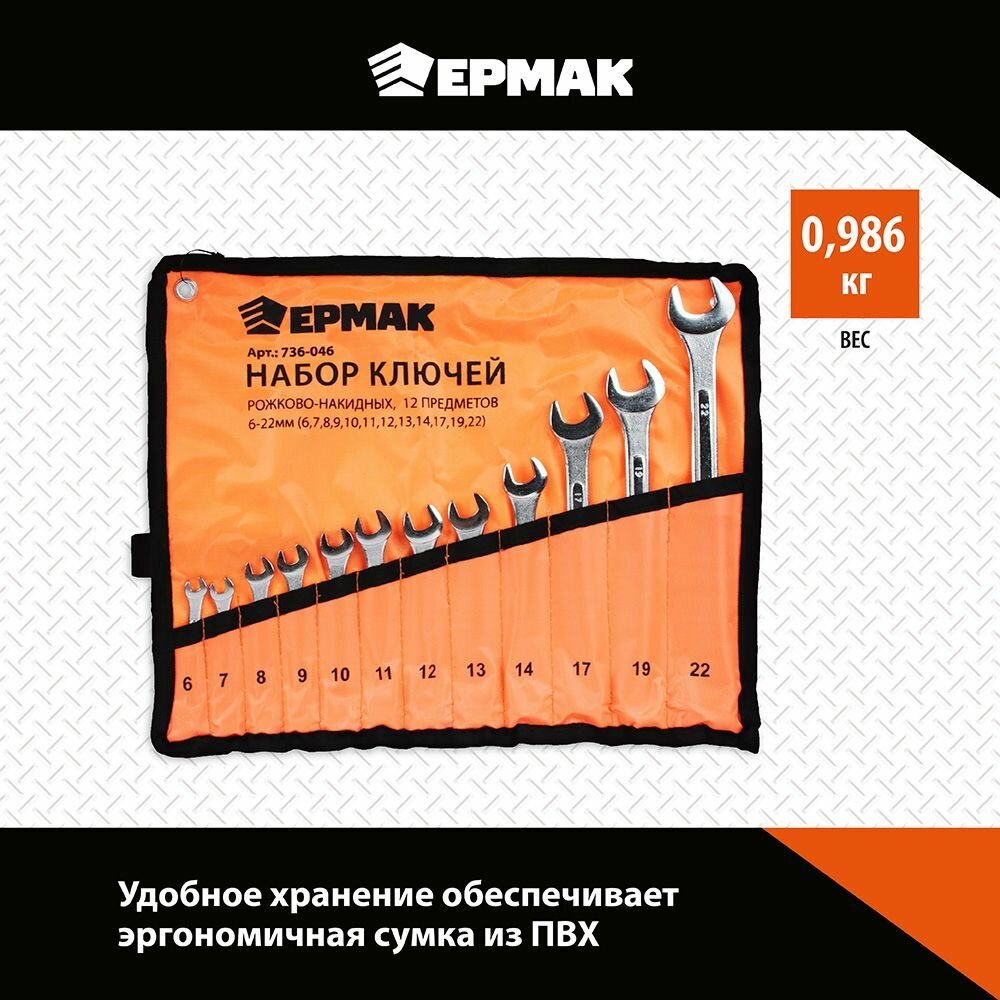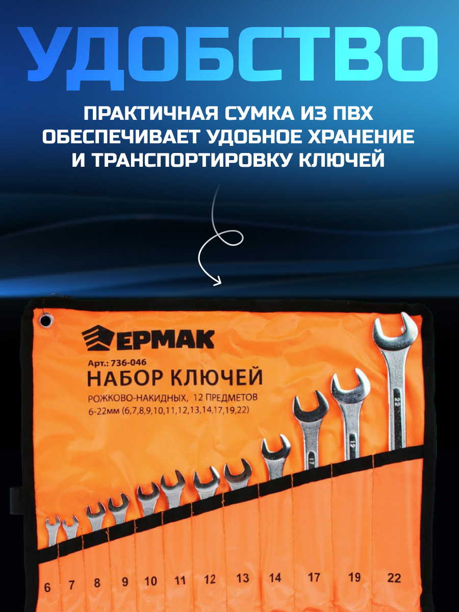 Набор ключей рожково-накидных 12 предметов 6-22мм усиленные (в сумке) ермак 736-046 ермак 736-046 | цена за 1 шт
