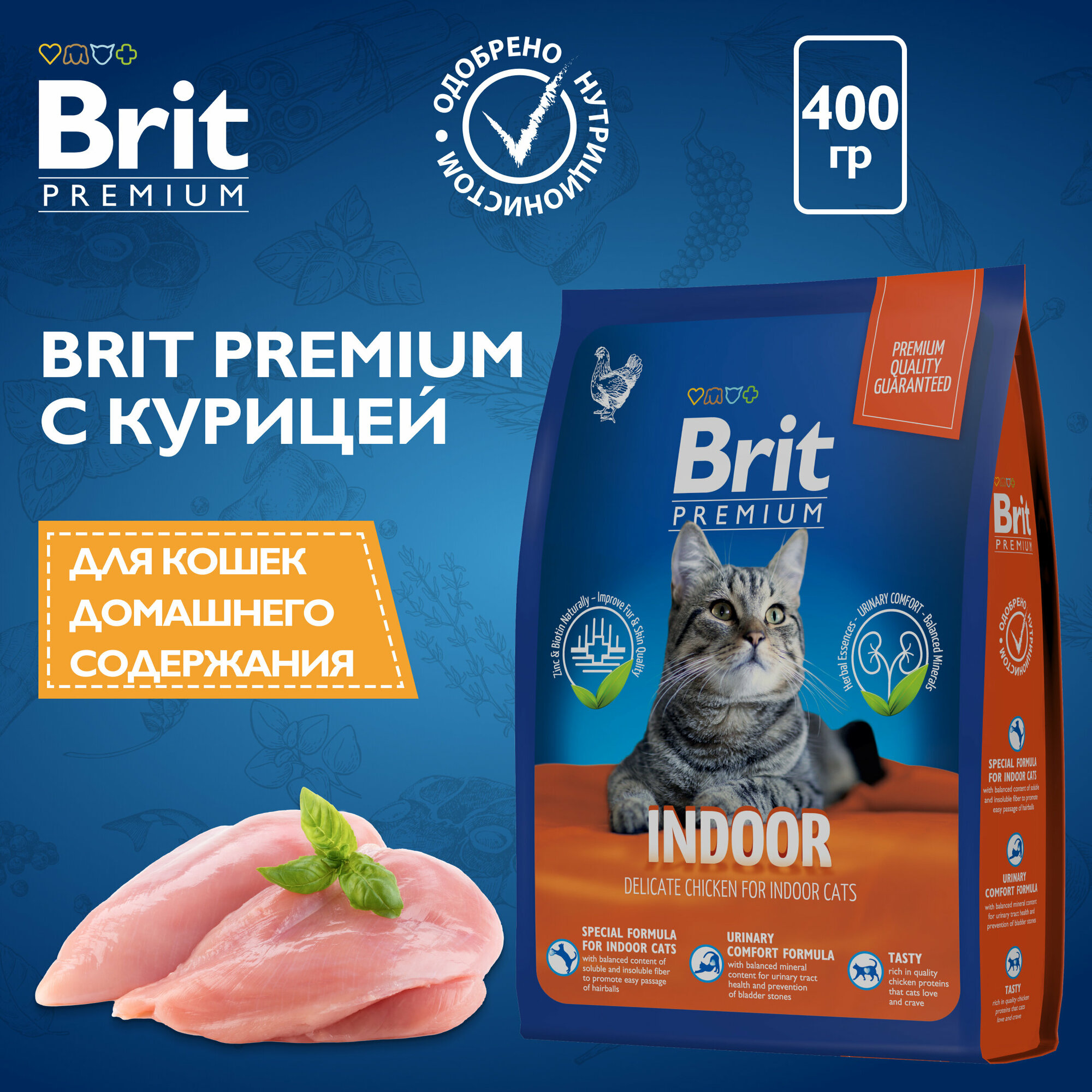 Полнорационный сухой корм Brit Premium Cat Indoor с курицей для кошек дом. содержания 0,4 кг
