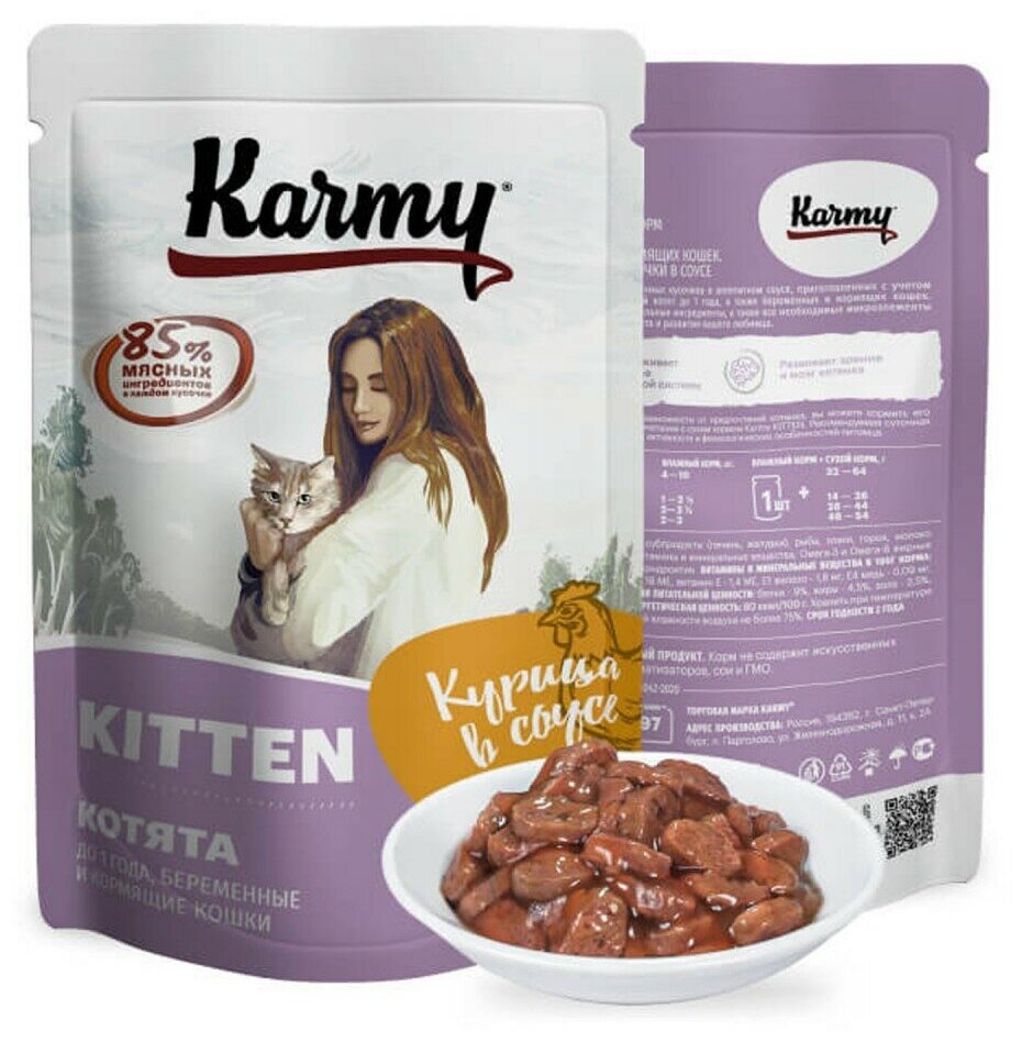 Влажный корм для котят и беременных кошек Karmy Kitten, курица 24 шт. х 80 г (кусочки в желе)