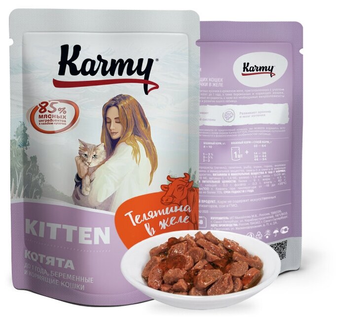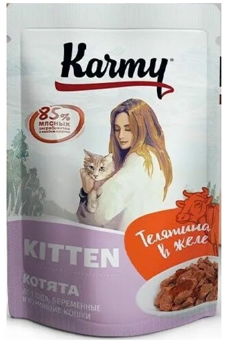 Влажный корм KARMY KITTEN для котят до 1 года, беременных и кормящих кошек Телятина в желе, паучи 80г.