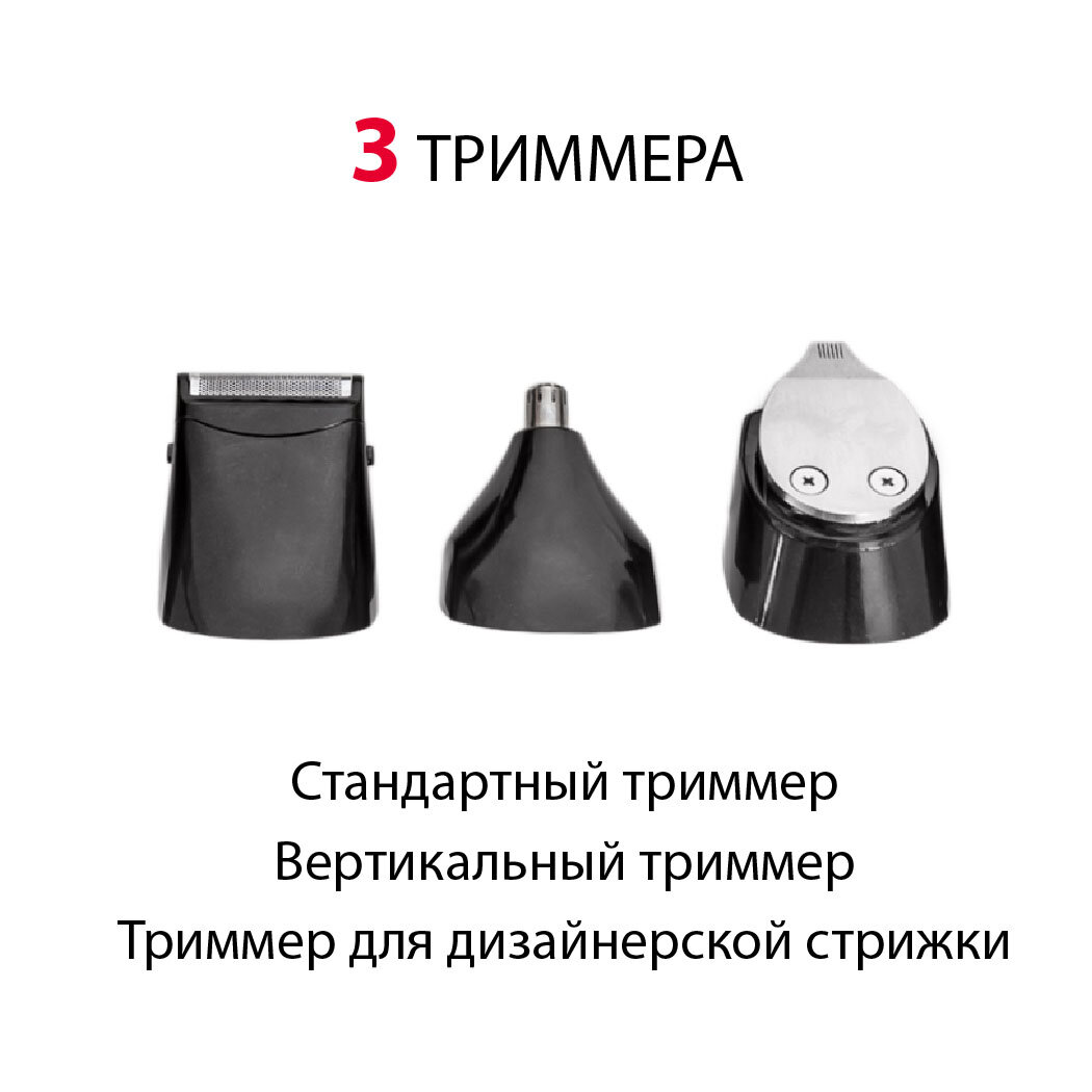| Дополнительная информация | корпус прибора со стандартным триммером, гребни для стандартного триммера - 4 шт., гребень для малого триммера, гребень для вертикального триммера, вертикальный триммер, расческа, насадка для носа и ушей, триммер для дизайнерской стрижки, масленка, адаптер питания, щеточка для очистки лезвий, подставка для хранения прибора, USB кабель для зарядки, гарантийный талон, инструкция на русском языке |