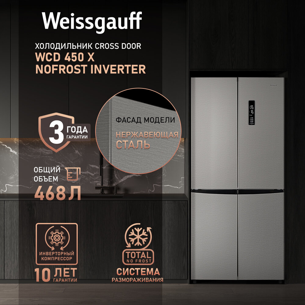 Отдельностоящий холодильник с инвертором Weissgauff WCD 450 X NoFrost Inverter четырехдверный холодильник, 3 года гарантии, система ионизации воздуха, большой объем, тихий режим, Зона свежести с контролем уровня влажности, LED-освещение