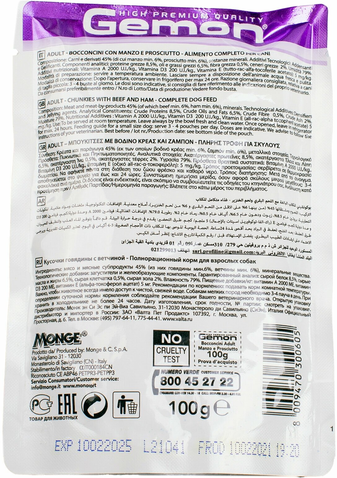 Купить Gemon Dog влажный корм для взрослых собак с говядиной и ветчиной в паучах 100 г