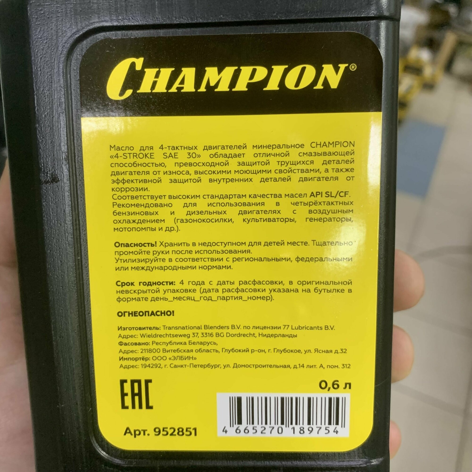 | Отзыв: | Специализированное масло для газонокосилок чемпион - ровно 600 грамм заливается, как и положено. Ни каплей меньше, ни каплей больше - всё чётко. Купил, старое слил, новое залил и по щюпу всё ровно - не нужно голову ломать. |