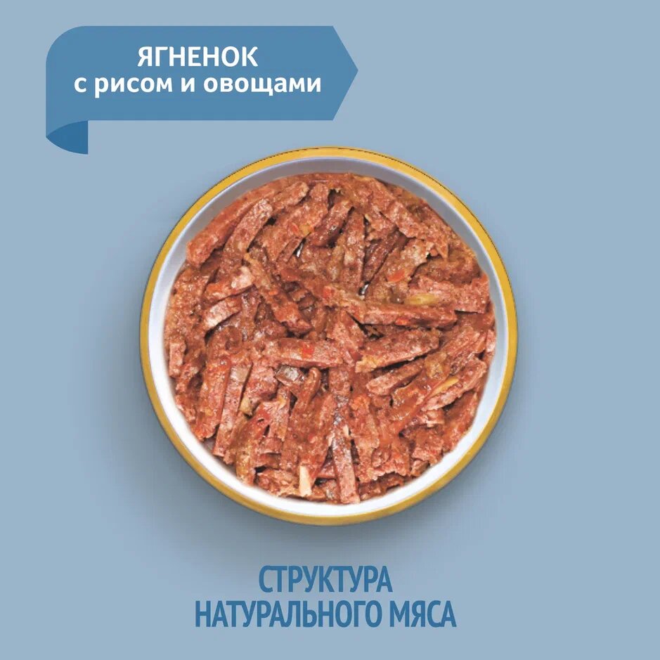 | Состав | филе ягнёнка, рубец бараний, бульон из ягнёнка, рис, морковь, зелёный горошек, масло растительное, желирующая добавка, рыбий жир, пивные дрожжи, морские водоросли, экстракт Юкка Шидигера |
