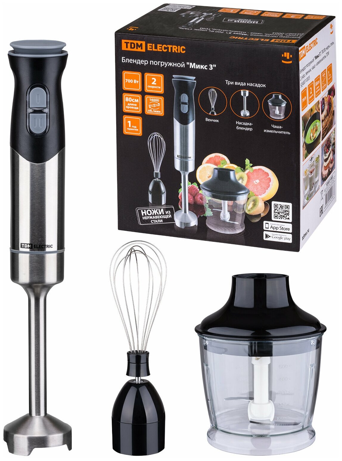 Блендер погружной TDM "Микс 3", 700 Вт, нерж. сталь, 2 скор., венчик, чаша - измельчитель