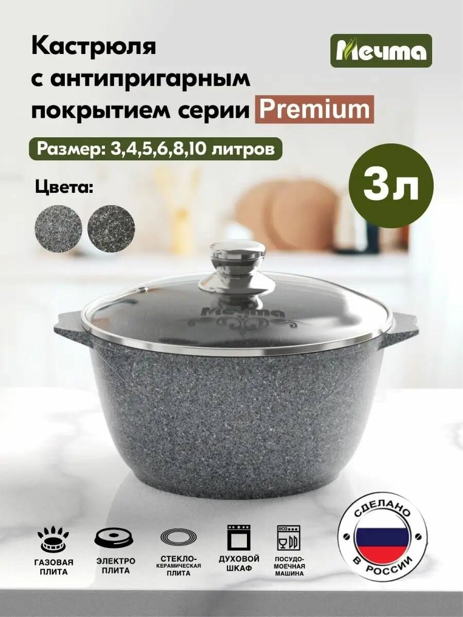 Кастрюля алюминий, антипригарное покрытие, 3 л, с крышкой, крышка стекло, круглая, Мечта, Premium grey, 43901, серая