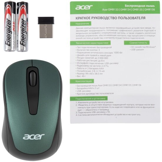 Мышь Acer OMR135 зеленый оптическая 1000dpi беспроводная USB для ноутбука 3but