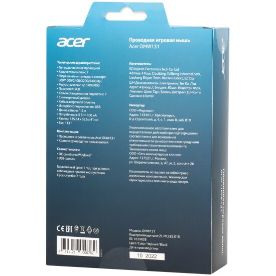 Мышь Acer OMW131, игровая, оптическая, проводная, USB, черный [zl.mceee.015]