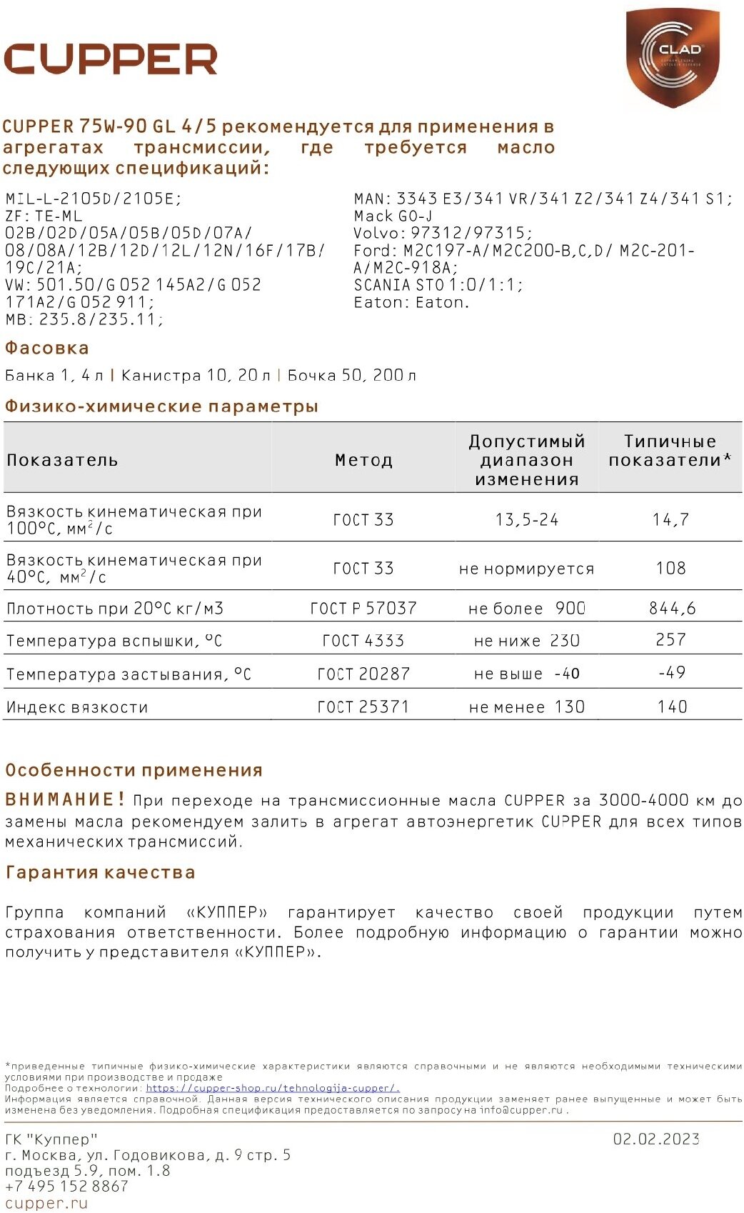 Масло трансмиссионное CUPPER 75W-90 XPF, 75W-90, 4 л