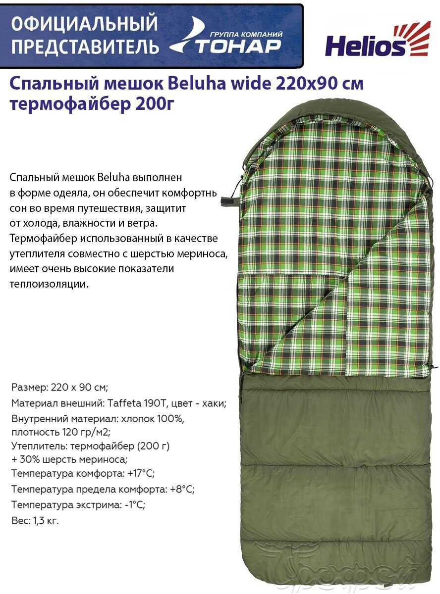 Спальный мешок Beluha wide 220х90 (200 гр/м.кв) хаки (термофайбер/шерсть) (HS-BELW-200) Helios