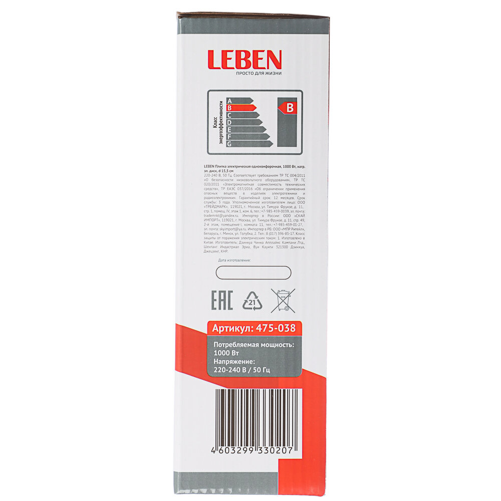 Электроплита 1 конф. LEBEN. 1000Вт. 475-038