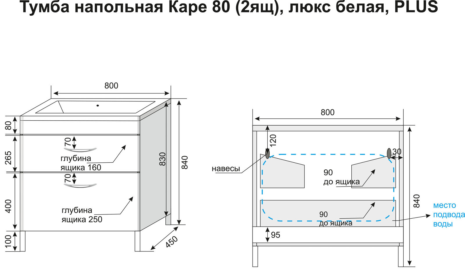 Тумба с раковиной напольная Style Line с раковиной "Каре 80" (2 ящ.) Люкс белая, PLUS