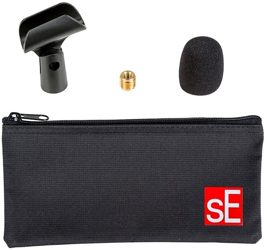 | Подробная комплектация | - микрофон; - микрофонный зажим; - адаптер с резьбой; - черная ветрозащита; - наклейка с логотипом sE; - транспортировочный чехол на молнии. |