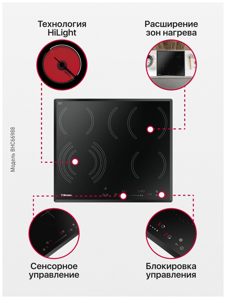 Электрическая варочная панель Hansa BHC66988, встраиваемая, 60 см, быстрый нагрев за 10 сек., автоматика закипания, таймер автоматического отключения, Немецкая стеклокерамика с сенсорным управлением интересное: