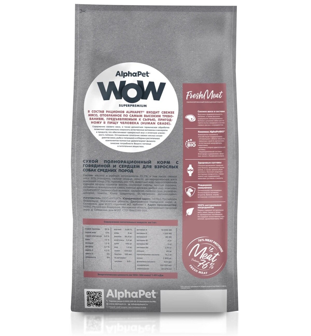 Купить Сухой корм AlphaPet WOW для взрослых собак средних пород с говядиной и сердцем 2 кг