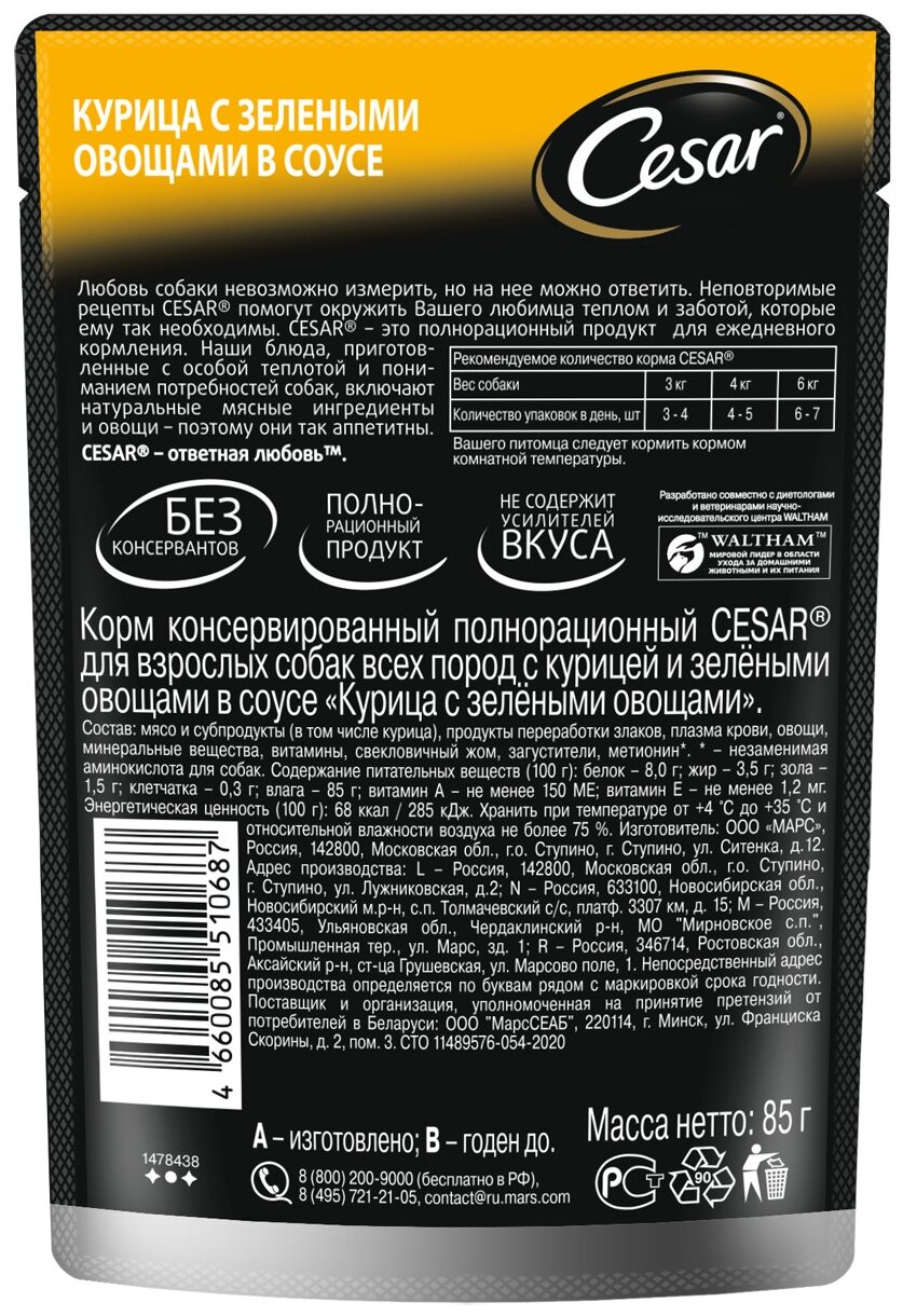 Cesar Паучи для взрослых собак с курицей и зелеными овощами в соусе 85г 10242611 0,085 кг 43486 (34 шт)