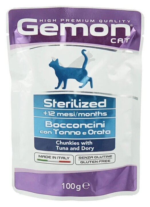 Gemon Cat Pouch Sterilised паучи для стерилизованных кошек кусочки тунца с рыбой дори 100г х 12 шт.