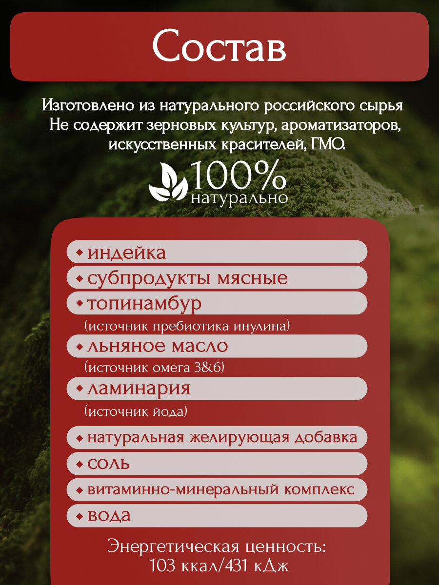 | Состав | говядина, рубец, сердце, субпродукты мясные, топинамбур, льняное масло, ламинария, натуральная желирующая добавка, соль, витаминно-минеральный комплекс, вода |
