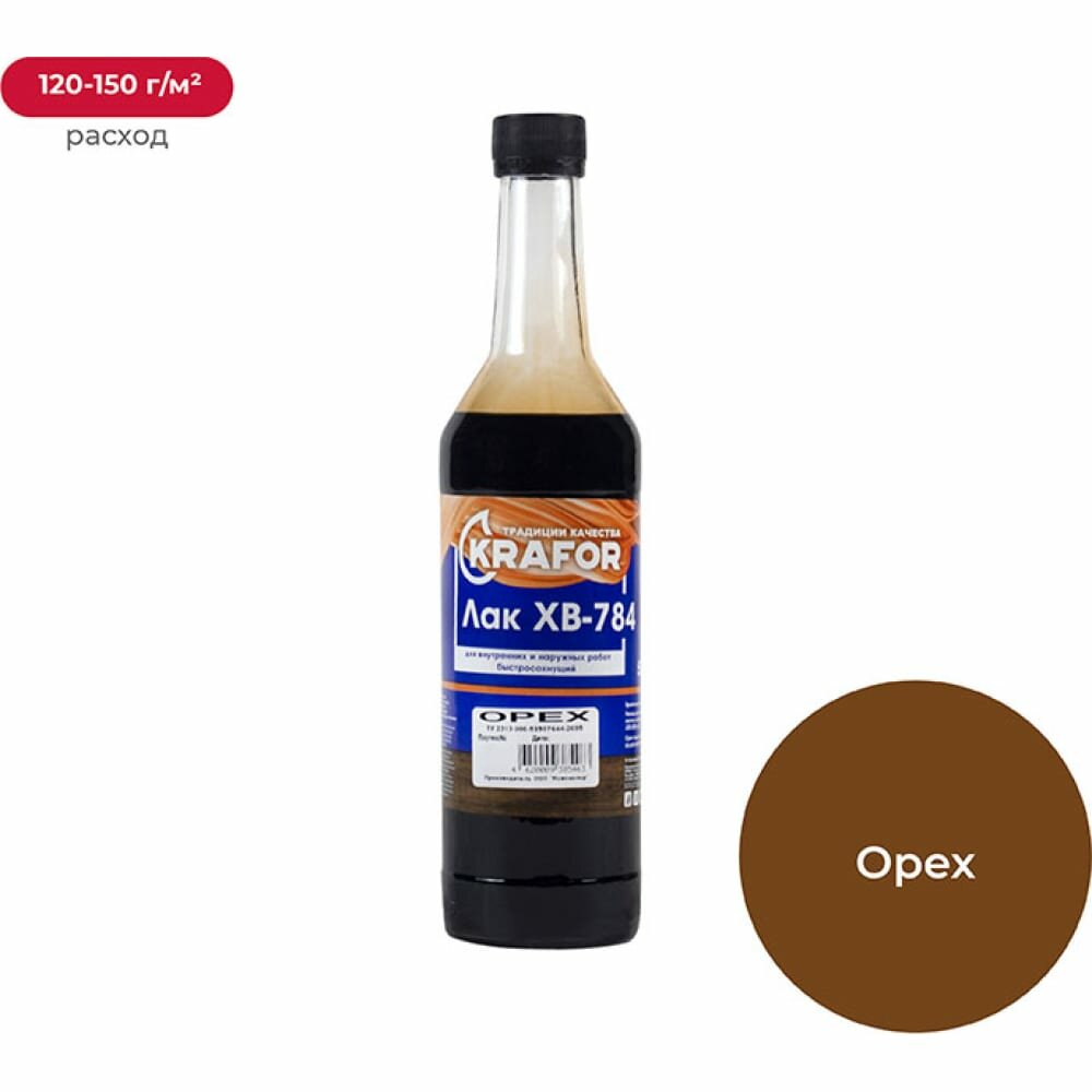 Лак ХВ-784 быстросохнущий Krafor, глянцевый, 0,5 л, дуб, 1шт, стеклянная бутылка