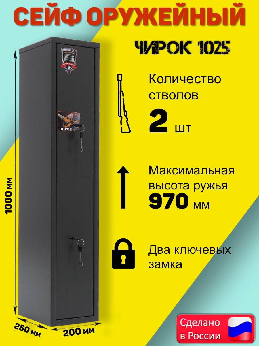 Сейф оружейный Aiko Чирок 1025 на 2 ствола, максимальная высота ружья 978мм, два ключевых замка, с отделением для патронов, ВхШхГ: 1000х200х250 мм интересное: