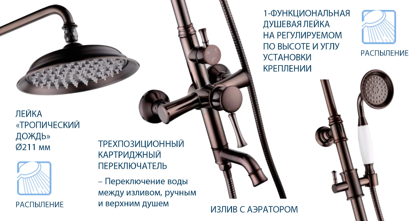 | Дополнительная информация | цвет черный кофе; высота стойки для душа: 1610 мм; диаметр душевой лейки: 80 мм; диаметр верхнего душа: 211 мм |