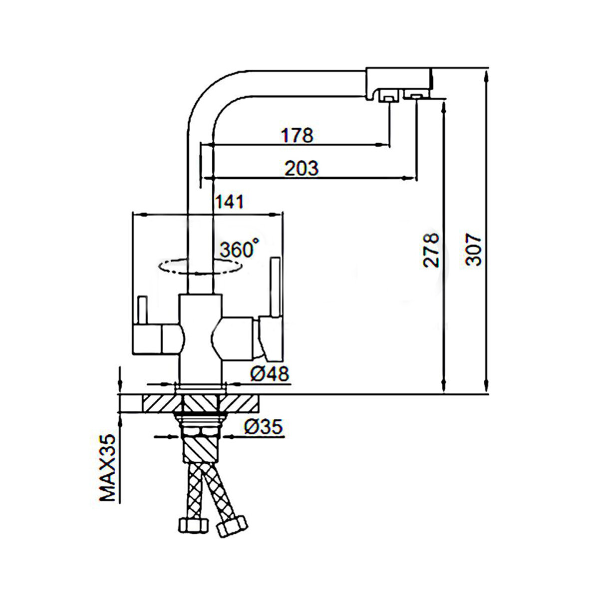 FRUD R43053-7, Смеситель для кухонной мойки под фильтр с краном для питьевой воды (поворотный излив, латунь, чёрный)
