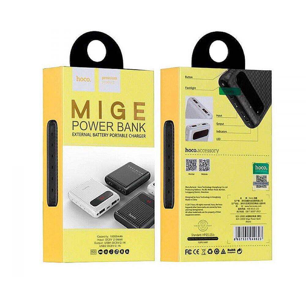 Аккумулятор внешний универсальный Hoco B20-10000 mAh Mige Power Bank (2USB: 5V-2.1A) Black Черный