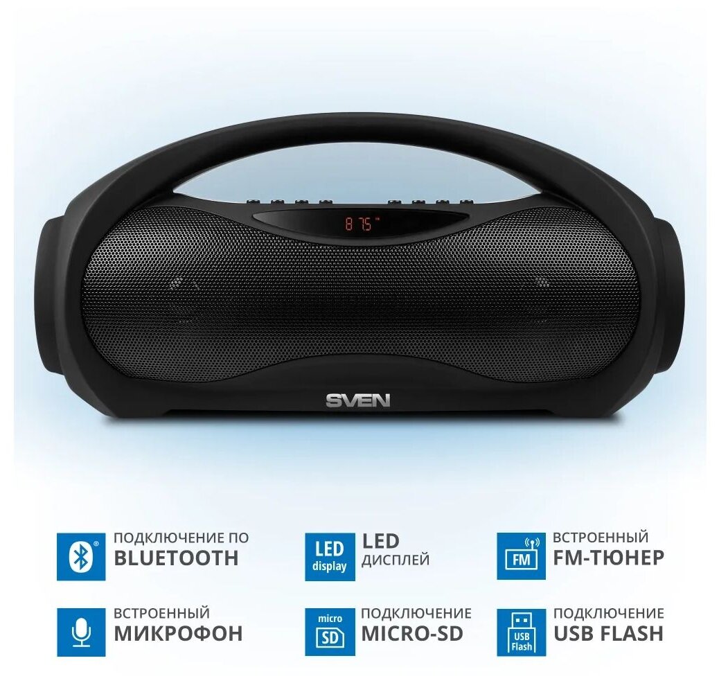Колонка портативная беспроводная bluetooth SVEN PS-420, переносная с радио и ручкой для переноски / Колонка блютуз музыкальная акустическая / 12 Вт / USB / microSD / LED-дисплей / 1800мА*ч