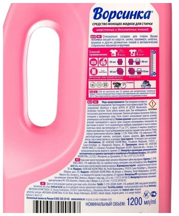 Жидкое средство Ворсинка для стирки шерстяных и деликатных тканей, 1,2 л 1575769