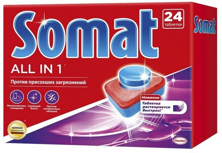 Таблетки для посудомоечной машины Somat, All in 1, 24 шт